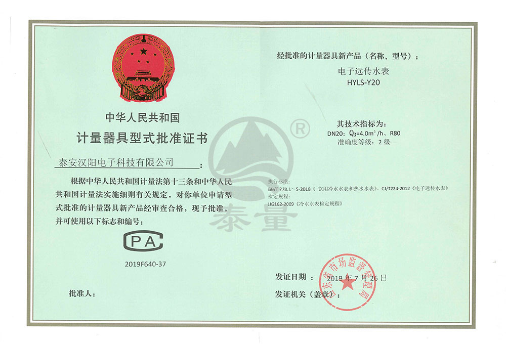 電子遠(yuǎn)傳水表型評(píng)證書