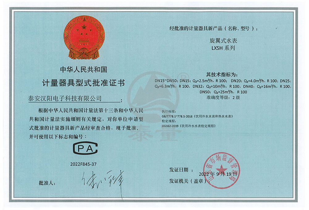 旋翼式水表型評(píng)證書